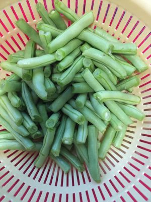 四季豆切五厘米的小段,植物油烧六七成热,放入四季豆段炸至表皮起皱捞出。