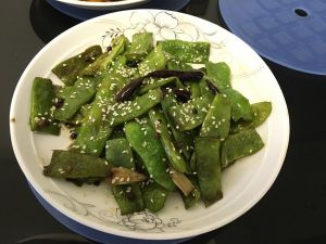 放入炸好的四季豆快速翻炒,依据各人口味,加入适量的糖或者盐调节一下口味,出锅,装盘。