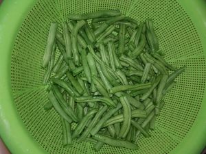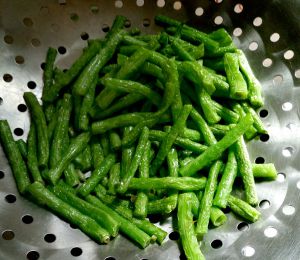 待油温到80℃时加入四季豆,小火慢炸,炸熟起火粒去多余油