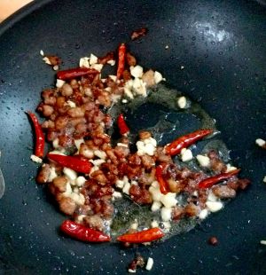 加入干辣椒,花椒粒以及郫县豆瓣酱,爆炒一下
