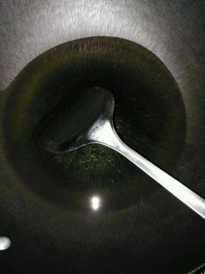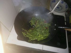 油烧热,放四季豆下去炸至如图所示有点虎皮样即可出锅