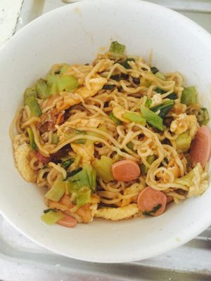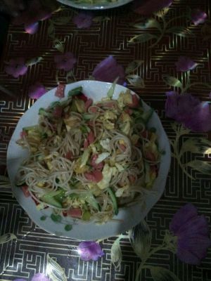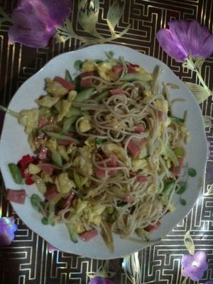 锅烧热加入葱花爆香,(油要多加点,防止面条粘锅)再加入凉好的面条用筷子翻炒,炒大约半分多钟加入少许味极鲜,少许盐(依个人口味添加),随后加入切好的鸡蛋,火腿丁,黄瓜条,翻炒片刻装盘即可。。。一盘美味的炒面就大功告成了。。。美美的吃一顿吧。。