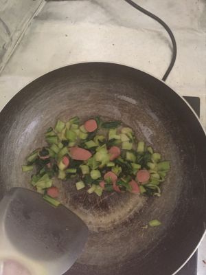 点火锅内放油 油热后放鸡蛋 放火腿肠 青豆 翻炒