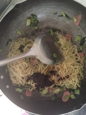加入鸡精 糖 美极鲜 翻炒 放面条 出锅前如果喜欢可以滴两滴香油