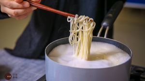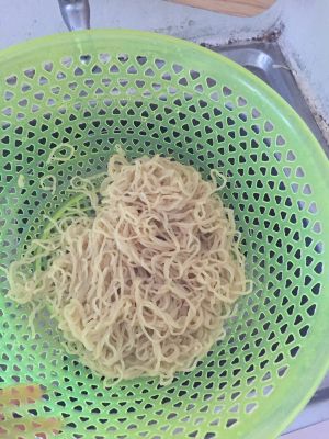 锅里烧开水,煮面,面不要煮太久,开锅冒花半分钟到一分钟之后就要立马捞起来放在凉水里激一下,然后放在筐子里沥干水分。