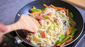 把沥干的面倒进去,加盐和鸡精来回翻炒,要用筷子挑着炒,这样不容易沾锅。炒5分钟左右出锅装盘。