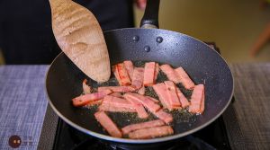 锅里放一勺油,油热后放入培根,煎炒出油份。