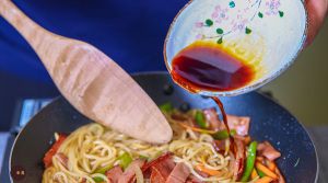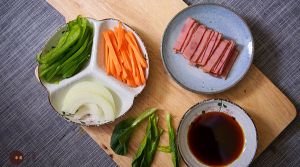 青椒、胡萝卜、洋葱切丝,培根切小片。取一只小碗,把料酒、六月鲜酱油、糖、盐都放一起调匀备用。