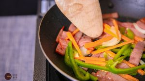 倒入洋葱丝、青椒丝和胡萝卜丝翻炒,炒至蔬菜都断生。