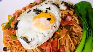 把煎好的溏心蛋卧在炒面上面,撒上海苔就好了。