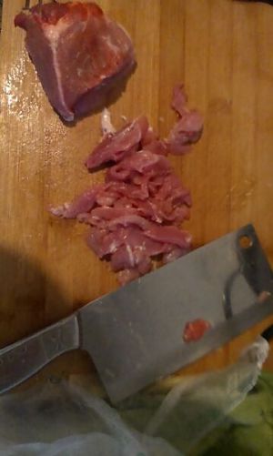 到油,油开翻炒鸡蛋,圆葱,肉丝,肉丝成熟放入煮好的切面,火腿,青菜翻炒,加少许水(面不成陀,有少许剩余即可)