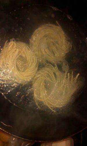 烧水煮面条,水开一会就可以捞起来了大概八分熟因为还要炒所以面条需要坚挺一点。