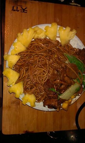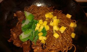 先加入面面翻炒几下,然后加入青菜和菠萝,再翻炒几下就可以出锅啦
