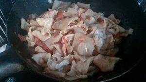 炒前准备,左下角的蘑菇是中午妈妈炒完剩下的,索性拿来一起炒了。