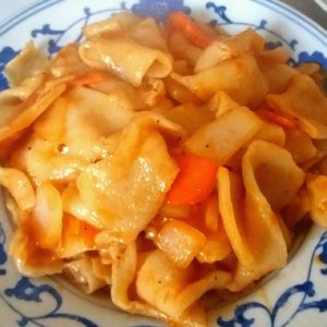 倒适量油,下蒜姜,肉,适度翻炒后倒肉丝,再加豆瓣酱,炒均匀,下辣椒,再加耗油,翻炒,下面条,一直炒至合适,加白糖盐味精。出锅!