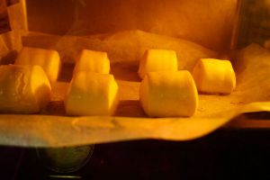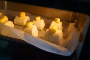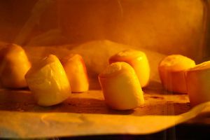 表面颜色变金黄后,将馒头一个个如图立起来,刷上融化在油纸上的黄油,令馒头上色更均匀