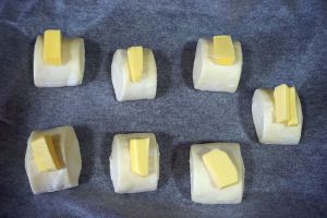 拿出小馒头放到铺好油纸的烤盘上,每个小馒头上码上一小块黄油
