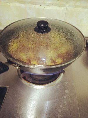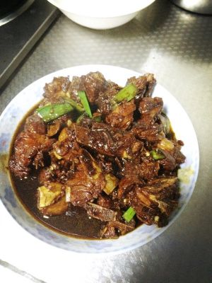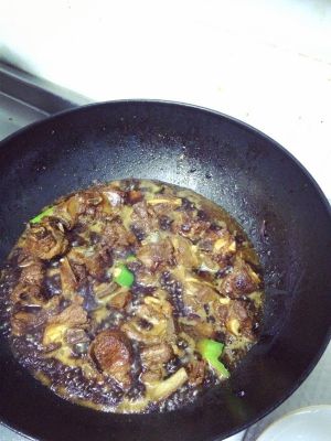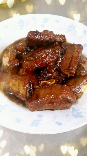 盖锅盖,中小火,炖30分钟左右(中间我是看了三四次,搅动了一下防止火太大糊锅),打开锅盖,开大火收汁(收汁前可以尝一下排骨的味道,如果不咸可以再加盐),收完以后就可以出锅啦,老公说味道不错呢!