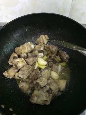 排骨翻炒一段时间后放入3段葱,3段生姜,大蒜块,干辣椒段,八角,花椒!然后加开水,水要没过排骨,盖上锅盖等它开。(水稍微多一点,如果少的话等放配菜就煮干了)