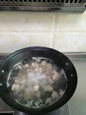 锅里放入凉水、排骨、2段葱,3片生姜,水刚开的时候加入一点料酒,然后煮个十分钟!捞出来冲洗(我是用温水冲洗的) 煮完后的水倒掉不要了。