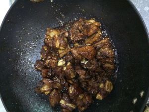 锅里放油、砂糖,一直搅一直搅,等泡泡快没有的时候放入排骨一直翻炒上色!(排骨上的颜色好不好取决于熬砂糖的时间,早了颜色上不去,晚了颜色又太黑)。