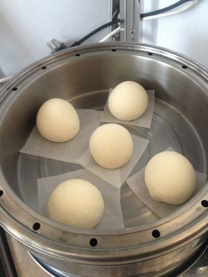 将半圆形小面片抹水粘在大圆面片四周。做好的馒头生胚放在蒸锅里醒发15分钟。蒸锅开大火,水开后调中火,蒸15分钟后关火,焖5分钟再出锅。