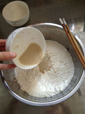 将面粉放入容器中倒入酵母水 边揉边倒 直至不沾变成一团
