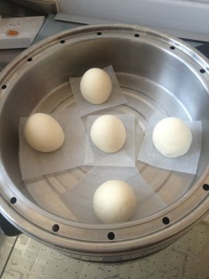 取一平底容器,将馒头生坯放入,盖上保鲜膜在温暖的地方静置25分钟
