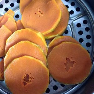 南瓜切薄片,放蒸笼上直接蒸熟。(这样蒸的好处是南瓜可以吸收较少的水分)