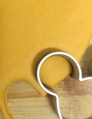 用模具取无数个半圆形小面团。(我是用米奇模具的头部来取的,你也可以用小圆形模具取圆形,然后从中间切开。或者用手捏出小圆形面团)