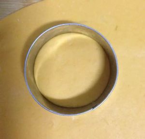 面团发酵至原体积两倍大。之后充分排气,并将面团擀成薄圆片。用圆形模具取一个圆形面片。