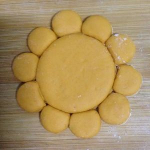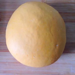将面粉、南瓜泥、适量酵母水放在一个较大的器皿里,用手揉成一个三光面团。