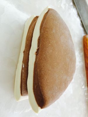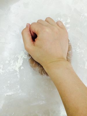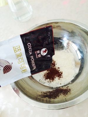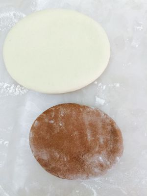 1碗面粉中加入可可粉,量可自定,有颜色就行,也可以换成红曲米之类天然色粉,再根据个人喜好加入砂糖,用剩余的酵母水和温水同样揉成面团