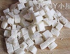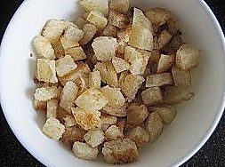 锅里加一点点油,放入馒头炒一下;馒头颜色变深就可以拿出备用;