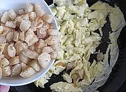 当蛋液快要收干时加入炒过的馒头丁翻炒几下;