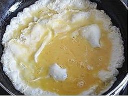 .转中火转动锅子,让蛋液均匀流到锅的四周;
