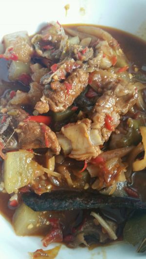 然后倒点海天酱油加凉水,淹没排骨盖上盖子熬干时加点鸡精和糖。
