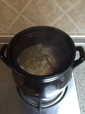 把所有材料倒进砂锅,大火烧开后转小火,一个半小时左右关火。注意不要熬干。