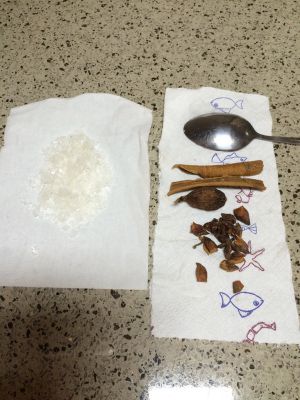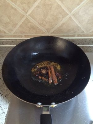 锅内放少许油,加入1颗草果,2颗大料,2片桂皮,炒出香味。