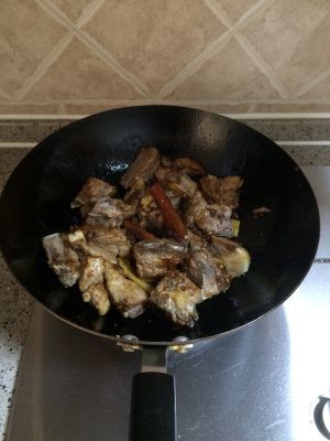 炒至排骨边角微微发黄即可。加入事先烧开的开水,把全部排骨没过即可。加入4勺生抽,2勺老抽。
