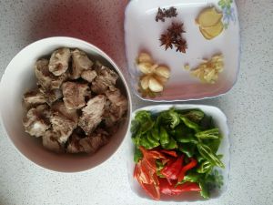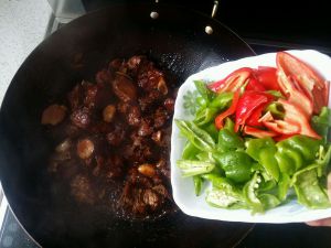 直到汤汁煮干,放辣椒,大火爆炒,放咸盐、鸡精。