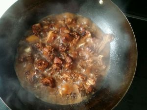 然后到水和红烧汁进去,用大伙熬到汁快没有的时候关火就完成了,切记什么调料也不用放,因为红烧汁已经很够味道了,所以不需要再放了。