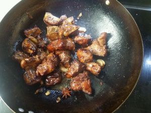 焯好后,温水冲洗,热锅放油,放糖,炒化放肉上糖色,放入洋葱碎,蒜,大料,桂皮,香叶,生抽,老抽,鸡精,放开水末过肉小火炖1个半小时