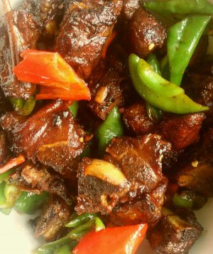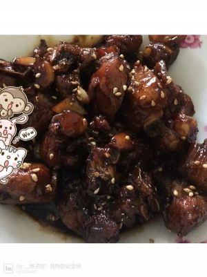 3.晾干蒸好的排骨 放油锅里 翻炒 加蒜末姜丝 继续翻炒 加啤酒 (啤酒会使肉质更加软)闷煮二分钟左右 加生抽 加点老抽 加点酱油 翻炒 再焖煮 差不多的时候加点红糖或者冰糖 收汁 装盘撒上熟的白芝麻 即可