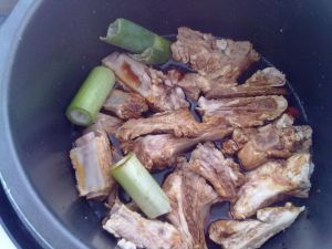 排骨放入电压锅中,加盐、老抽、八角、料酒、葱姜蒜段、少许清水。压10分钟。