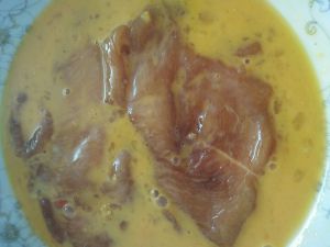 腌好之后将鸡肉放入蛋液中,让鸡肉粘满蛋液