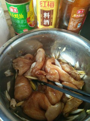 放入料酒,老抽,耗油,盐,腌半个多小时