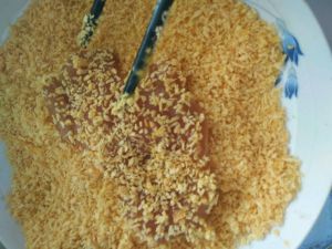 面包糠,和淀粉也要准备好,一定要买这种黄黄的面包糠,白色的太硬