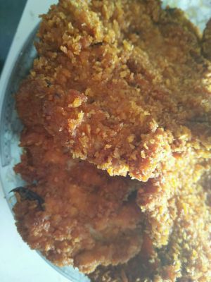两面都沾满面包糠,等油热了放入鸡肉,炸至两面金黄。