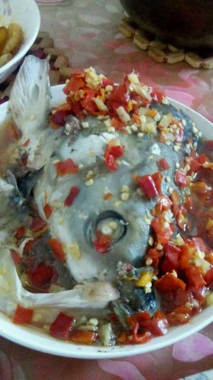 这步忘拍照了,图片不对的哈。腌制好的鱼头,放锅里隔水蒸10分钟。蒸好后取出,倒掉里面的汤汁。剁椒,食用油,鸡精,少量酱油调和成酱,这样可以使酱料挂在鱼头上比较均匀,入味。涂上酱料后,重新上锅蒸10分钟。